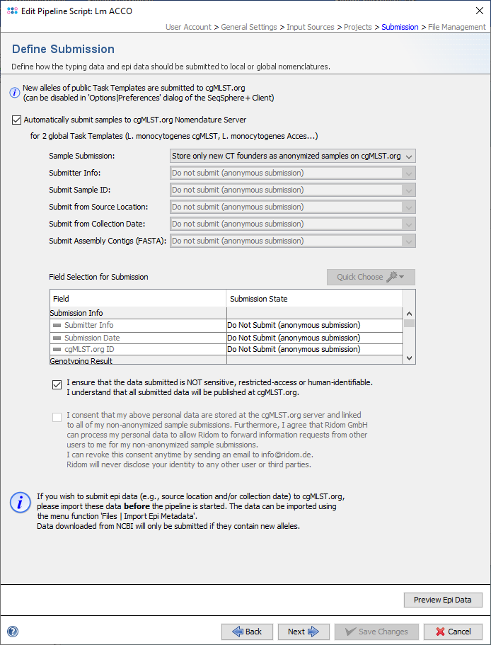 For public cgMLST Task Templates an automatic submission to cgMLST.org can be enabled here. If this option is enabled, the Submission Anonymization Filter for the pipeline script is shown and can be adjusted to control which data fields and level of details should be submitted to cgMLST.org. In addition, then the checkbox (declaration that data is not sensitive, etc.) shown below needs to be checked.