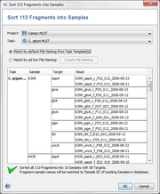 By default only chromatogram files are shown in the browser. Use the Assembling PreviewThe Assembling Preview on the right side is used to arrange reads into different Samples, Task Entries and targets before performing the assembling. The Use the file browser to navigate to your sequence files or to an upper directory, and select the files or the directory to which they belong to. Sort Reads into TargetsPress the button A new dialog window will appear. Select the Project to which the sequences should be added. The task selection can normally be left to automatically. According to the file naming conventions, the software now tries to sort the read files into Samples, Task Entries and targets. The result is shown in the preview table: each row stands for one read file. By default the file naming conventions are taken from the selected Task Template. To use other file naming conventions, select Match by ad hock File Naming and press the Create File Naming button to define a new file naming on the fly. If the sorting was successful, click the OK-button to create the previewed Samples. Control the ResultThe assembling preview panel shows a preview of the Samples to which the sorted reads will be added. If the sample name that was extracted from the file name of a read file matches an existing Sample in the selected Project, then the read is added to this Sample. Read files can thus be added to existing Samples by using corresponding file names. The result list on the right shows the newly added reads highlighted yellow, and the already existing reads highlighted blue. Clicking the OK-button starts the assembling process and opens the Samples in the main window. |