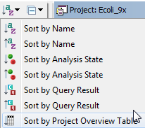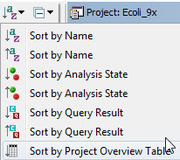 The table can be sorted by clicking the column headers. The sort order can be transferred to the navigation tree by selecting Button16-SortByTable.png Sort by Project Overview Table from the sort-list.