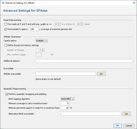 OverviewSPAdes (version 3.11.1, citation) is a de novo assembler for whole genome read data that can be used in the SeqSphere+ assembling pipeline if the software is running on Linux. As SPAdes is not available for Microsoft Windows it is only delivered with the Linux version of the Ridom SeqSphere+ Client. SPAdes works well for assembling reads from Illumina systems or from Ion Torrent machines. Quality TrimmingSPAdes performs a trimming of the read data. Therefore it is not recommended to use the SeqSphere+ read trimming as pre-processing (disabled by default). DownsamplingTo reduce the size of the output files and time and memory usage, the input files can be downsampled. Downsampling randomly removes reads so that the given approx. size is obtained. If quality trimming is selected, downsampling is done on the trimmed reads. RemappingBy default a remapping is performed in a pipeline that uses SPAdes with the default settings. After the SPAdes process has finished, BWA is used to align the reads against the resulting assembly contigs. BWA mem is used as algorithm and for the resulting alignment (BAM file) a new consensus is called. As SPAdes is known to create inacurrate alignments for lower coverage, the consensus calling procedure is configured to use a threshold of 5 as minimum coverage to call a non-ambiguous base. The required read support for a consensus base is 60%. SPAdes OptionsAn automatic k-mer selection of SPAdes based on sequence length (e.g., 21,33,55,77 for 150bp and 21,33,55,77,99,127 for 250bp) is used for the assemblies by default. However, this can be changed by input of command line parameters in additional options. The "--careful" option performs a mismatch correction. This option is enabled by default in the pipeline. If the Sequencing Platform of the pipeline is set to Ion Torrent, the "--iontorrent" option is automatically added. The number of threads and maximum memory usage can be specified. If nothing is specified, the SPAdes default is used (16 threads). Furthermore, additional command line parameters for SPAdes can be defined (e.g., the k-mer selection). If SPAdes was used as assembler in a pipeline, then the logging output of SPAdes can later be viewed in the Procedure tab of the finished Sample. SPAdes VersionIf no path is given, the SPAdes executable (spades.py) is searched in the subdirectory ext/ of the SeqSphere+ Client installation directory. To update the SPAdes version, the full spades installation directory could copied in the ext/ directory, after removing the old one. However, SeqSphere+ is only tested with the SPAdes version that is delivered with the software. |