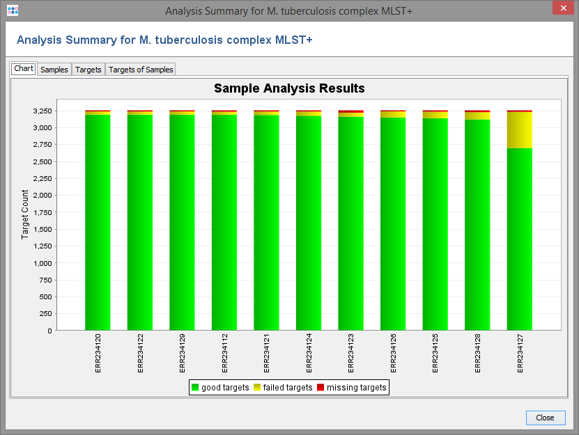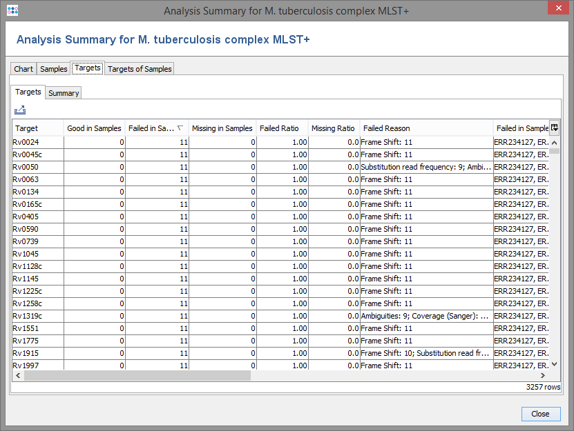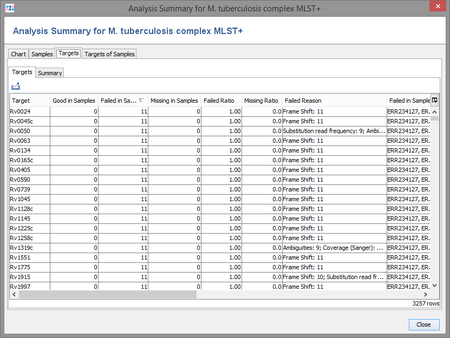 Tables that show the distribution of not found/failed/good targets per Sample and the results per target are also included. The column "Fail Reason" contains the distribution of the first analysis problems found. Additionally, the following functions can be included in the calculation: