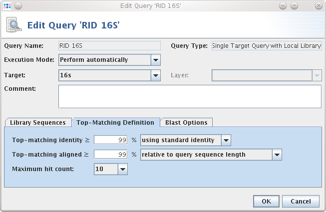 GeneralSingle target sequence library queries are used to search the sequence of one target in local a sequence library. Normally this query should be used for single target Task Templates, but it can also be used to query only one target of a multiple target Task Template. Definition PanelThe definition panel is used to define and edit the query. The following fields can be set in the upper part of the panel: