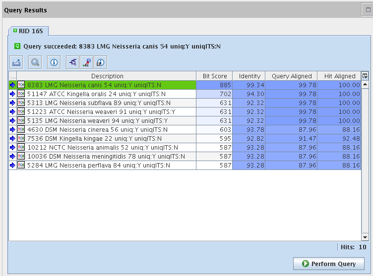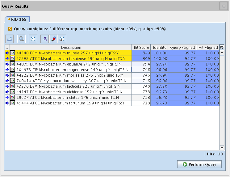 Result PanelThe result panel that is a part of the Task Entry overview shows the BLAST result table of the query. If the result has a unique top-matching hit, this row is highlighted green. If multiple hits fulfill the top-matching thresholds, all of those are highlighted yellow. The toolbar shows the following buttons: