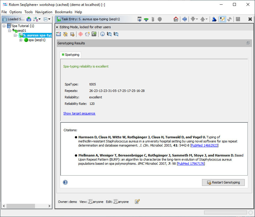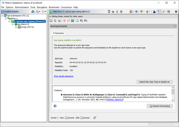 ContentsIntroductionThe Staphylococcus aureus spa-typing task template can be used for WGS (from reads or pre-assembled) and for Sanger sequencing data to assign a type based on the repeat region of the Staphylococcus aureus protein A gene (spa). To guarantee a standardized nomenclature, the spa-types and repeats are named by a global nomenclature that is controlled by the Ridom SpaServer. They are named with an ID which is either a leading "t" (spa-type) or "r" (repeat) followed by a unique number. The current version of the task template requires SeqSphere+ client version 8.3 (and server version 8.3) or later. It can be downloaded from the Task Template Sphere. Information on how to import a StaphType database can be found in the FAQ. For Sanger sequencing data, the algorithm is exactly the same as in the former StaphType software. For WGS data, the spa-typing task tries to find the repeat region by searching for all known repeat sequences. If a repeat region is found, it is trimmed by the 5' and 3' signatures (RCAMCAAAA, TAYATGTCGT). Then the trimmed region is searched for known repeats and for potentially new repeats that are matching a specific pattern. If the known repeats are matching a spa-type, this spa-type is assigned. Finally the spa-typing result is QC controlled by determining a reliability rate (see table below). If multiple regions (e.g., on multiple contigs) with repeats are found in the first step, a spa-type is only called, if exactly one region has a sufficient spa-typing result, or if all regions have the same spa-type. The Task Entry Overview for a spa-typing task shows a result message colored by the reliability, the four result fields, and potentially links to unreliable positions in the sequence that need to be checked. Submitting New Spa-TypesIf an unknown spa-type is found and the reliability is "good" or "excellent" (reliability rate >= 95), the new spa-type can be submitted to the SpaServer by using the submission button in the Task Entry overview. Please note that with WGS data new spa-types that contain no new spa-repeat(s) can be submitted only. New spa-types that contain new spa-repeat(s) can be submitted with Sanger data only. The following meta-data fields are submitted together with the sequence data and the spa-typing result:
