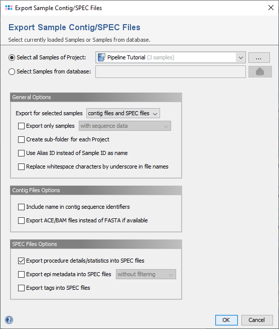 The Tools menu function Export Sample Contig/SPEC Files can be used to export the assembly contigs of multiple samples to files (FASTA). It can also be used to to export parts of the metadata of sample into special files (SPEC) that can be automatically imported by SeqSphere+ when the contig files are later imported again.