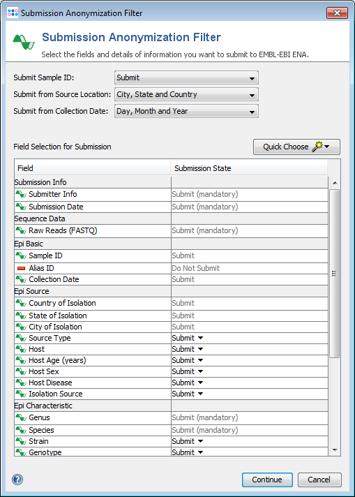 The Submission Anonymization Filter dialog appears each time before samples are manually submitted to a public database, i.e. to the cgMLST.org nomenclature server or to EBI ENA. The dialog is also shown when a pipeline is defined that is foreseen to submit to cgMLST.org. The Submission Anonymization Filter is used to define the level of metadata that should be submitted to the public database. Except for the submitter information at cgMLST.org any submitted data is made publicly available.