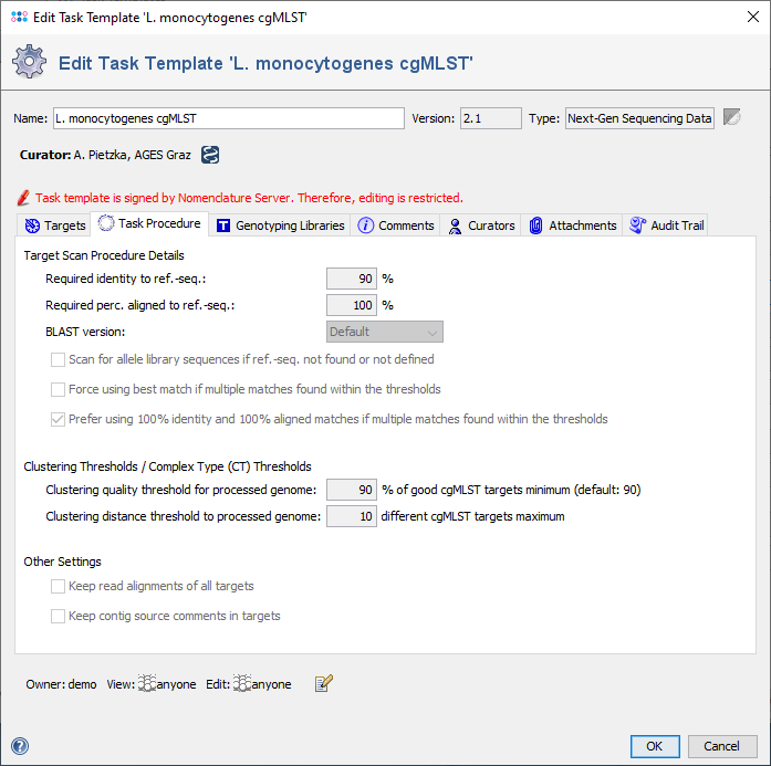 Hint: For public cgMLST Task Templates that were downloaded from the Task Template Sphere the thresholds are not editable. The quality threshold also defines if a sequence can be submitted to the nomenclature server. The clustering distance threshold also defines the cgMLST Complex Type (CT) distance.