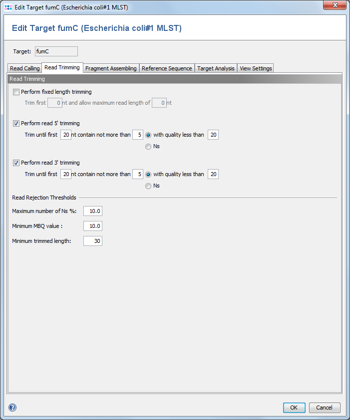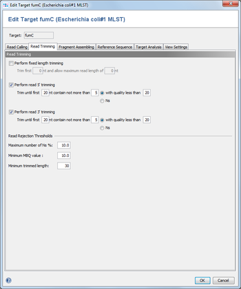 Three thresholds can be set to define a minimum quality a read must meet to be used in an assembly. If a read does not surpass these thresholds, it will be marked as rejected in the Navigation tree. All thresholds refer to the trimmed sequence, if trimming was enabled.