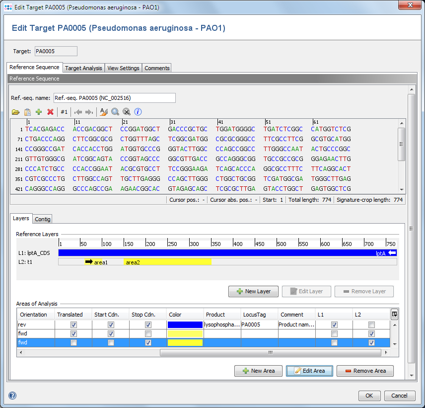 Defines the 5' and the 3' signature for a contig target. For convenience the signatures can be copied directly from a selection made in the reference sequence (buttons 5' and 3').