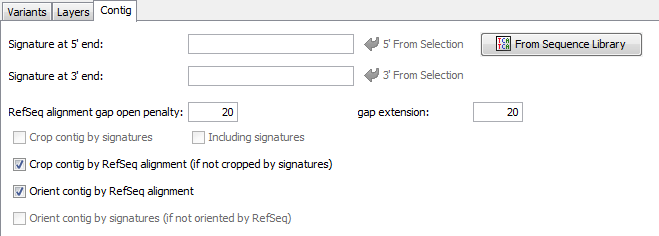 In addition the signatures can be imported from a multiple alignment file by using the From Sequence Library button. Again an inclusive consensus will be called and the beginning and the end of the consensus can be used as signatures. The Including signatures check-box can be used to define, if the signatures itself should belong to the contig, or not.