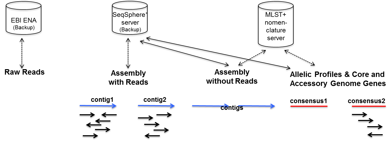 The whole assembly and cgMLST allele calling procedure usually takes less than 1h per sample (if processed with recommended maximum coverage of 120x). Therefore, one SeqSphere+ client easily scales with the output of one MiSeq machine run in 24/7 mode. |