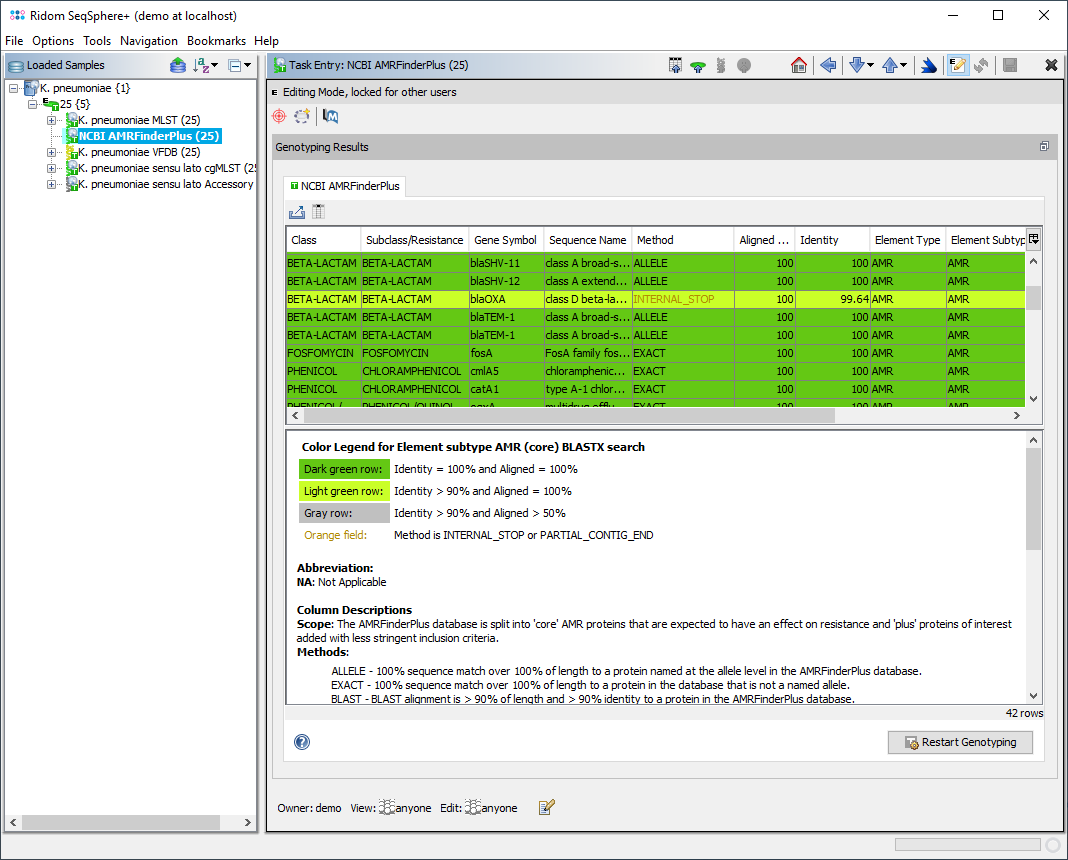 ContentsIntroductionNCBI AMRFinderPlus (Antimicrobial Resistance Gene Finder Plus; citation) is used to find AMR-specific genes and proteins from the NCBI Bacterial Antimicrobial Resistance Reference Gene Database (BioProject PRJNA313047). Furthermore , genes related to biocide and stress resistance, general efflux, virulence, or antigenicity are searched ('plus' option). In SeqSphere+, only the BLASTX protein search from translated nucleotide sequences of the assembly contigs against the AMR protein database is used to identify AMR proteins (the HMMER search to detect new resistances is currently not used in SeqSphere+). NCBI AMRFinderPlus is deployed with the SeqSphere+ installation, but requires that the SeqSphere+ client is running on Linux or on Windows with installed Windows Subsystem for Linux (WSL). The predefined task template 'NCBI AMRFinderPlus' can be downloaded with Linux or Windows clients from the Task Template Sphere (requires SeqSphere+ version 7.0 or later) for all organisms except Mycobacterium. For Escherichia coli the specific task template 'E. coli NCBI AMRFinderPlus' is listed for download in the Task Template Sphere. Alternatively, AMRFinderPlus can also be called with those clients as standalone function in the tools menu. Once downloaded the task template is stored on the server. Therefore, this task template now becomes also available for clients without installed WSL. If such a client tries to execute a pipeline that makes use of a ‘NCBI AMRFinderPlus’ task template an error will be elicited (also when the Test Pipeline Script function is performed). However, viewing AMRFinderPlus results produced with an appropriate client is possible with all clients. Disclaimer: Users of AMRFinderPlus or its supporting data files are cautioned that presence of a gene encoding an antimicrobial resistance (AMR) protein or resistance causing mutation does not necessarily indicate that the isolate carrying the gene is resistant to the corresponding antibiotic. AMR genes must be expressed to confer resistance. Many AMR proteins reduce antibiotic susceptibility somewhat, but not sufficiently to cross clinical breakpoints. Meanwhile, an isolate may gain or lose resistance to an antibiotic by mutational processes, such as the loss of a porin required to allow the antibiotic into the cell. For some families of AMR proteins, especially those borne by plasmids, correlations of genotype to phenotype are much more easily deciphered, but users are cautioned against over-interpretation (cited from AMRFinderPlus documentation). Task Entry OverviewWhen a NCBI AMRFinderPlus task entry is processed, SeqSphere+ starts the deployed AMRFinderPlus. The Task Entry Overview of the processed task entry shows a table with the AMRFinderPlus output with the target genes found. If multiple matches for a target are found on different locations, each match is listed as separate row in the table. The table rows for Element subtype AMR (core) and for E. coli Class STX are colored by the percental identity and alignment overlap with allele in database using the following thresholds: