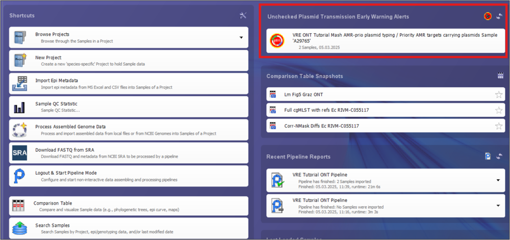 - Step 1: Log into the software again. On the top right of the home screen you will see a new entry under Unchecked Plasmid Transmission Early Warning Alerts.