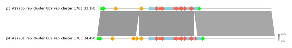 You can clearly see the high similarity between the two plasmids with the exception of two genes missing in A27901. If you hover of these genes with the mouse, you can see that the missing genes are vanZ, as already seen in the tabular view, and sat4, another AMR gene.